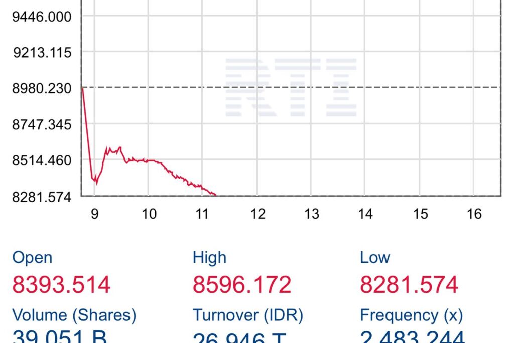 Jakarta – Indonesia’s benchmark stock index, the Jakarta Composite Index (JCI/IHSG), came under severe pressure ahead of the close of the first trading session on Wednesday (January 28, 2026), tumbling 7.71 percent or 692.47 points to 8,287.76 as of 11:15 a.m. local time.