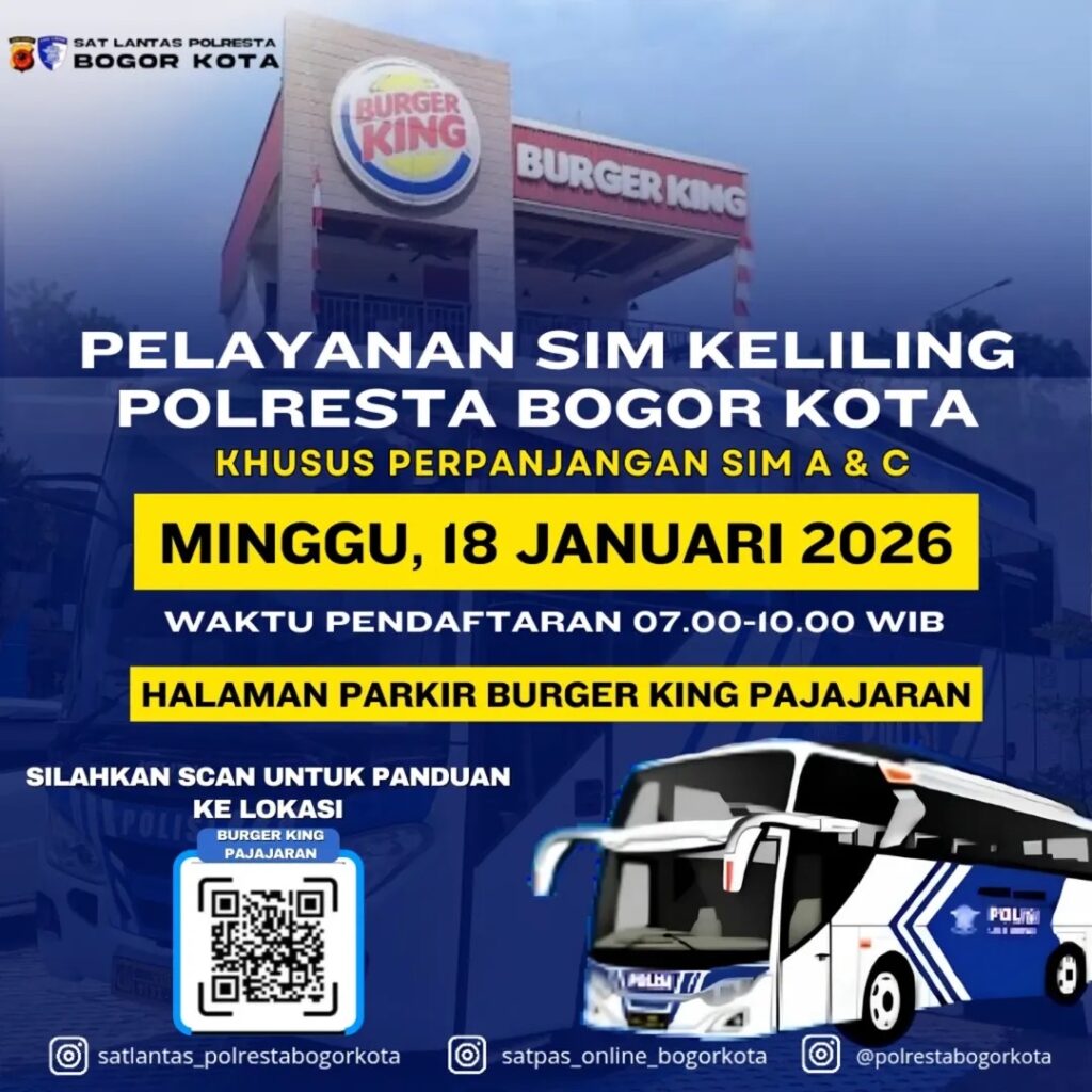 Program SIM Keliling ini khusus melayani perpanjangan SIM A dan SIM C yang masih berlaku, sebagai bagian dari upaya Polresta Bogor Kota dalam mendekatkan pelayanan publik kepada masyarakat, sekaligus meningkatkan kepatuhan administrasi berlalu lintas.